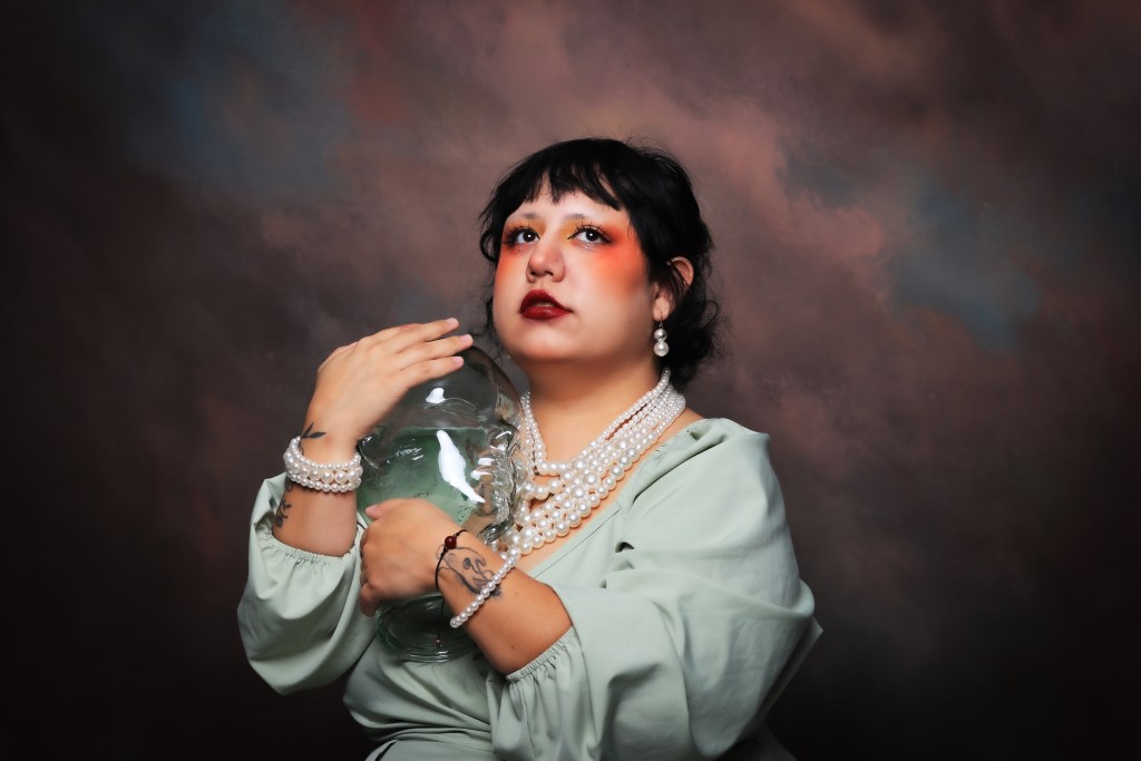 Sombras, perlas y símbolos se entrelazan para crear imágenes que evocan pinturas antiguas reinterpretadas desde una mirada contemporánea.